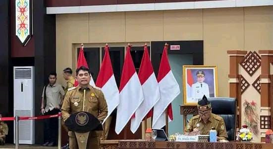 Bupati Barito Utara, H. Shalahuddin, S.T., M.T., di dampingi Plt. Kadis Pertanian Kabupaten Barito Utara, Plt. Kadis Lingkungan Hidup, Kaban Pengelola Pendapatan Daerah Kabupaten Barito Utara, Kadis PUPR beserta unsur jajaran pemerintah daerah Barito Utara, menghadiri Rapat Koordinasi (Rakor) Optimalisasi Pendapatan Asli Daerah (PAD) sektor Perkebunan dan Kehutanan Tahun 2025 yang diselenggarakan di Aula Jayang Tingang, Kantor Gubernur Kalimantan Tengah, Palangka Raya, Senin (20/10/2025).